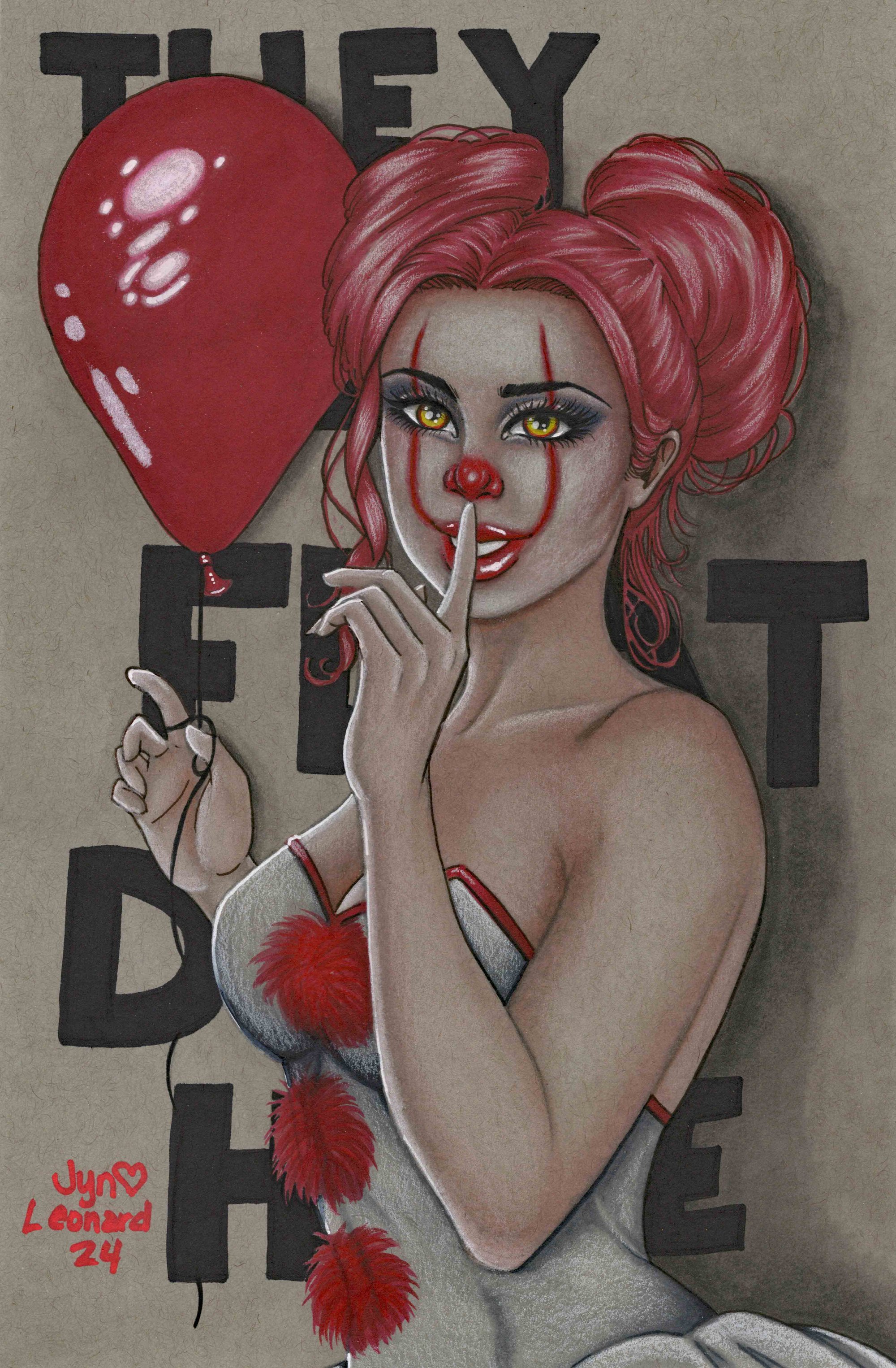 Original art of IT's Pennywise cosplay on a modern comic sized toned page.
